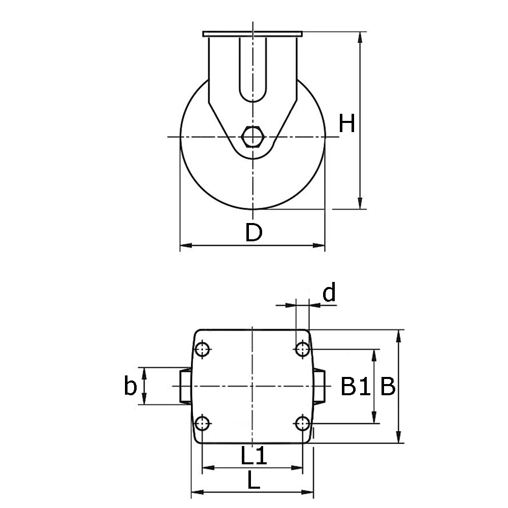B=Plattenbreite, b=Breite Lauffläche, B1=Abstand der Bohrungsmitten, D=Ø-Rad, d=Ø-Bohrung, H=Bauhöhe, K=Maximale zulässige statische Tragfähigkeit in kg bei 3 km/h, L=Plattenlänge, L1=Abstand der Bohrungsmitten, Typ=Lagertyp
