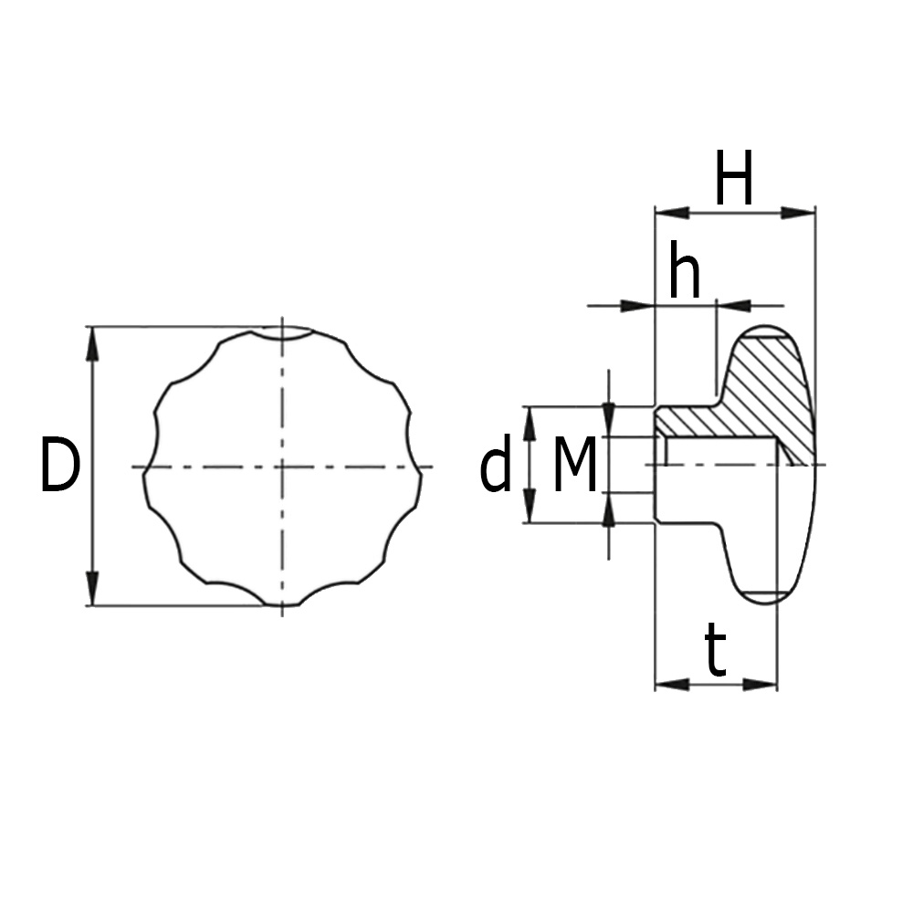 D=Knopf-Ø, d=Bund-Ø, H=Totale Höhe, h=Höhe Bund, M=Gewindemaß