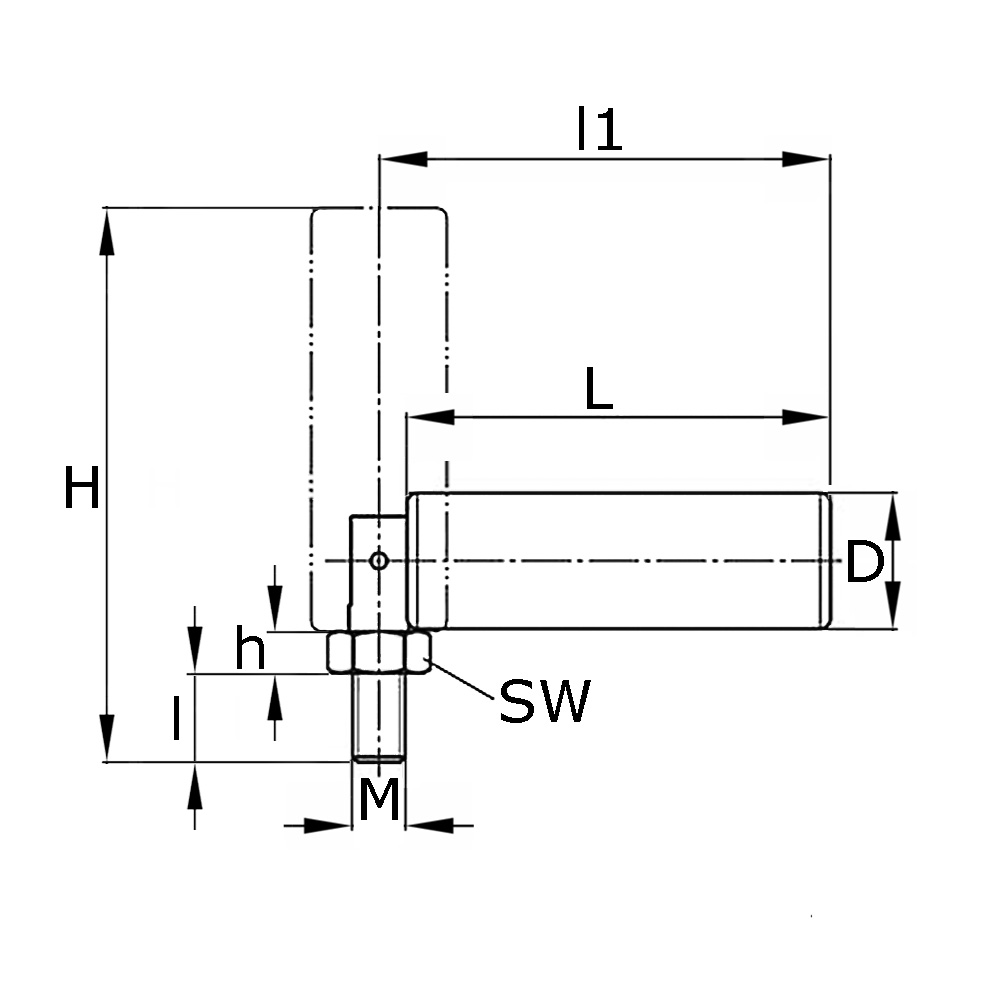 D=Griff-Ø-groß, d=Höhe Sechskantmutter, L=Grifflänge, l=Gewindelänge, M=Gewindemaß, SW=Schlüsselweite