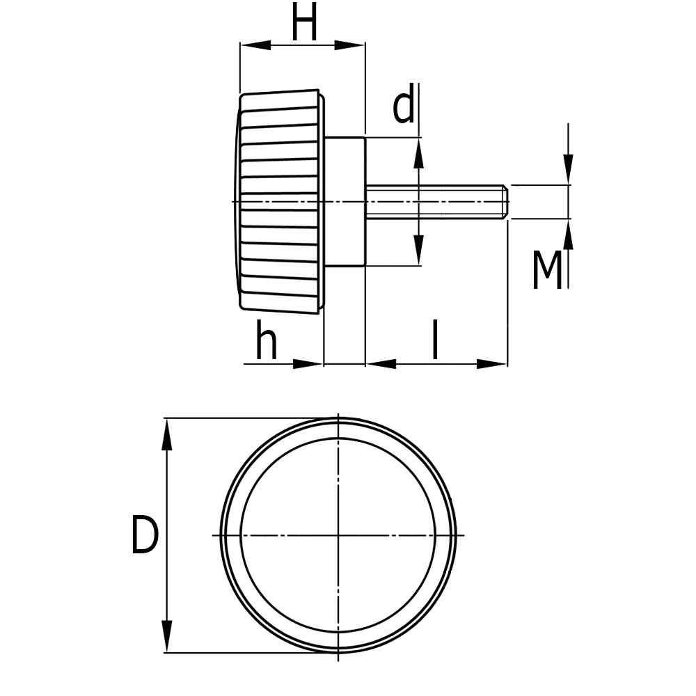 D=Knopf-Ø, d=Nabe-Ø, H=Knopfhöhe, h=Nabenhöhe, l=Gewindelänge, M=Gewindemaß