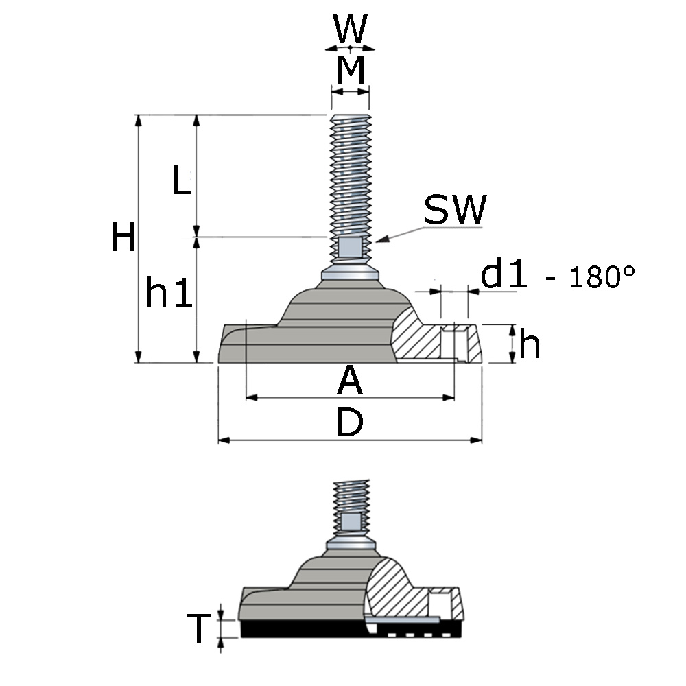 A=Totalhöhe, D=Fuß-Ø, d=Abstand der Bohrungsmitten, H=Gewindelänge, h=Höhe, K=Maximale statische Belastung in kg, M=Gewindemaß, SW=Schlüsselweite, W=Maximaler Aufstellwinkel in °