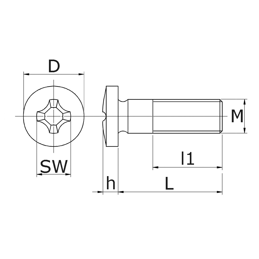 D=Ø-Kopf, h=Kopfhöhe, l=Schraubenlänge, l1=Länge Teilgewinde, M=Gewinde, SW=Schlüsselweite