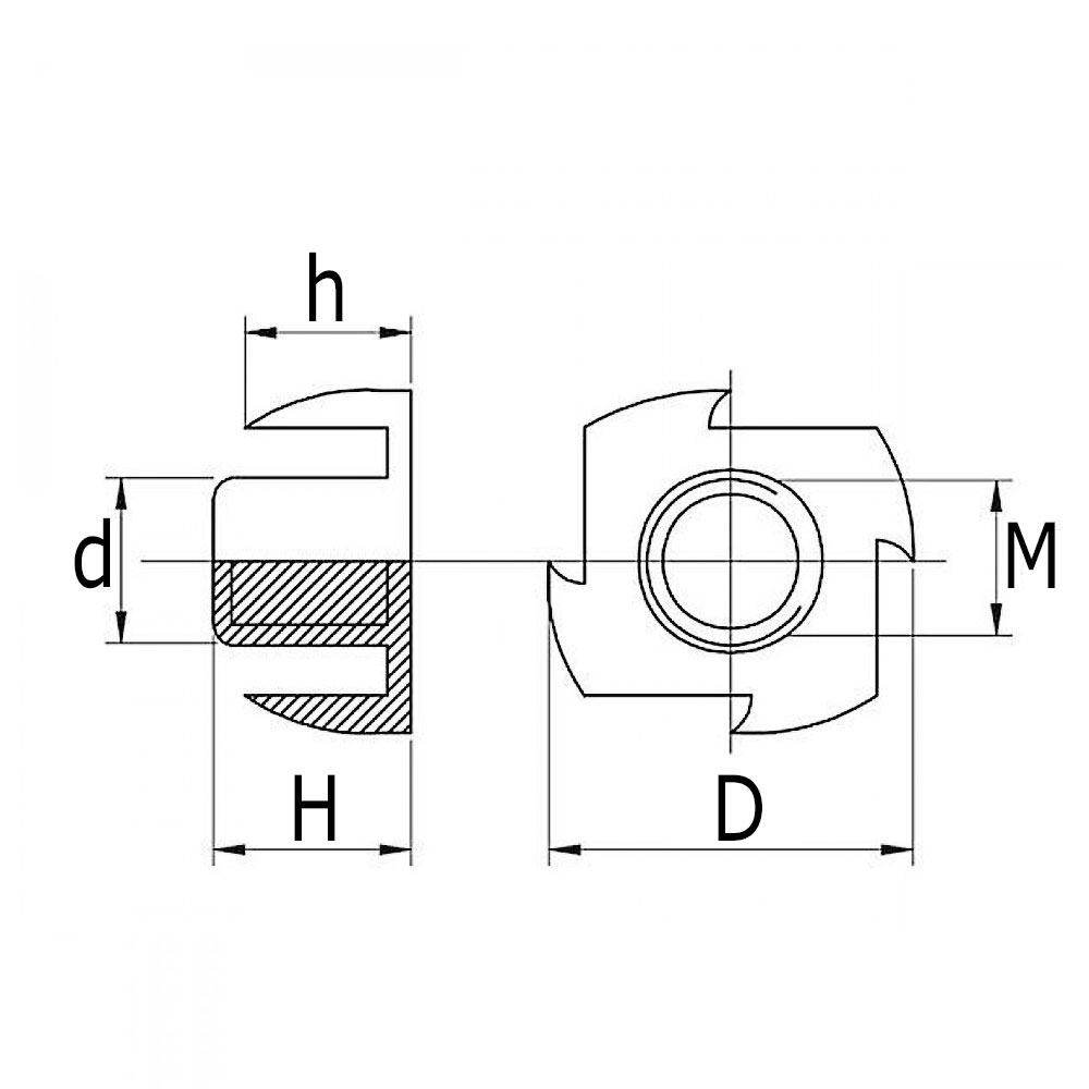 D=Außen-Ø, d=Außen-Ø, H=Totale Höhe, h=Höhe Zacken, M=Gewindemaß