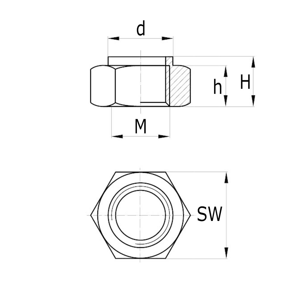 D=Ø-Außen, H=Totalhöhe, h=Höhe, M=Gewinde, SW=Schlüsselweite in mm