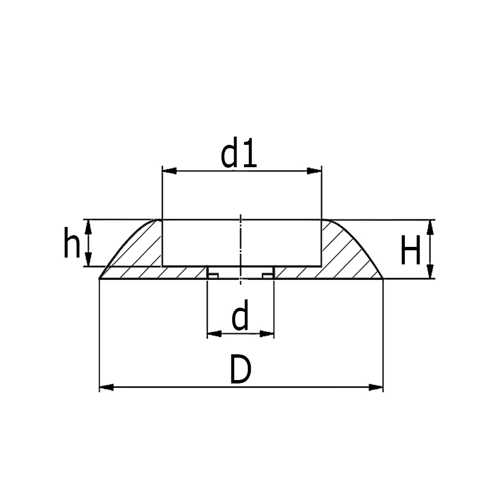 D=Außen-Ø, d=Ø-Bohrung, d1=Kegelsenkung, H=Totalhöhe, h=Höhe, M=Geeignet für metrisches Gewindemaß