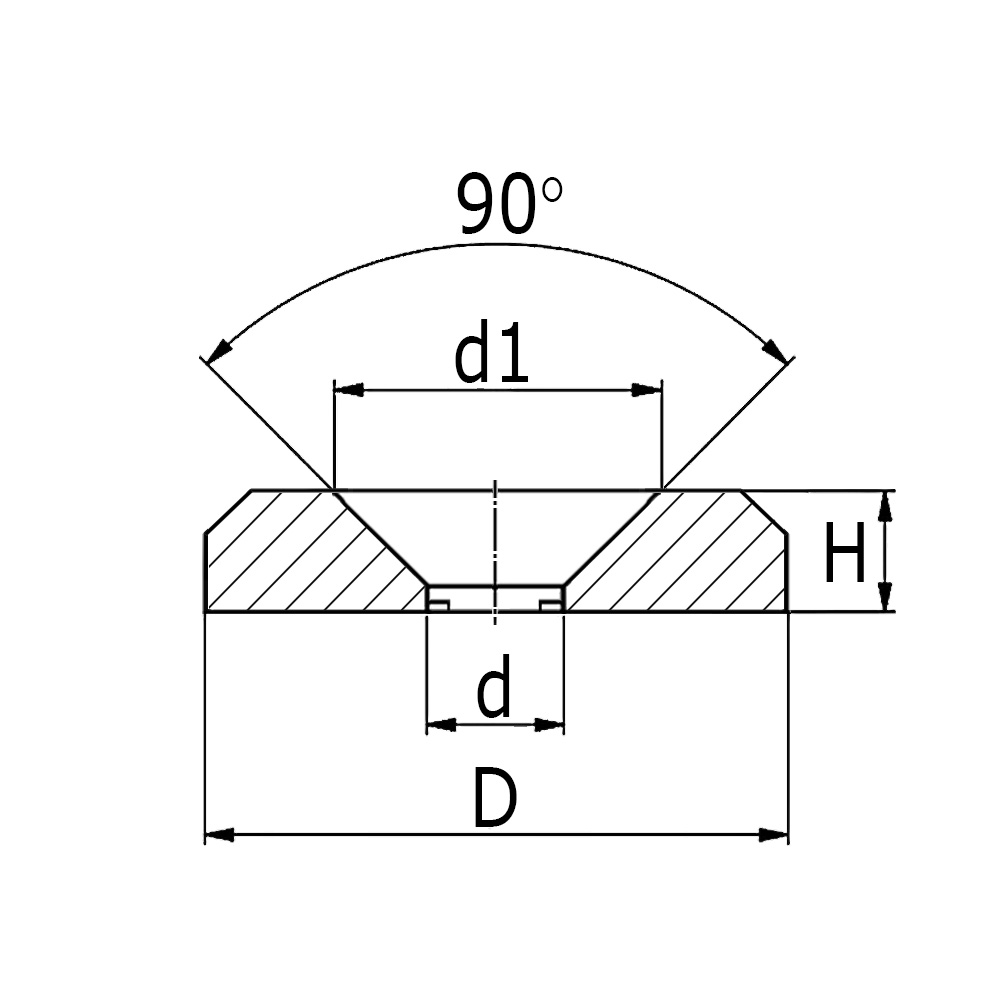 D=Außen-Ø, d=Ø-Bohrung, d1=Kegelsenkung, H=Totalhöhe, M=Geeignet für metrisches Gewindemaß