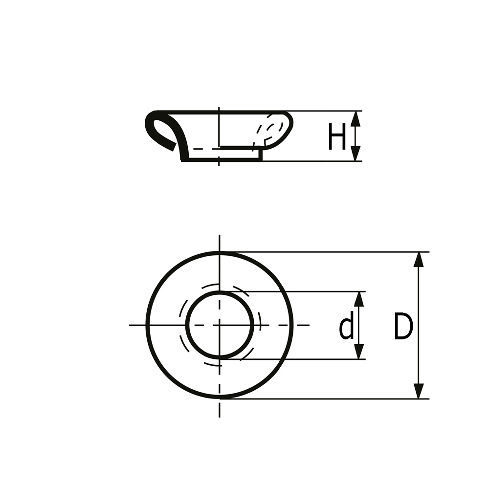 D=Außen-Ø, d=Ø-Bohrung, H=Totalhöhe, M=Geeignet für metrisches Gewindemaß