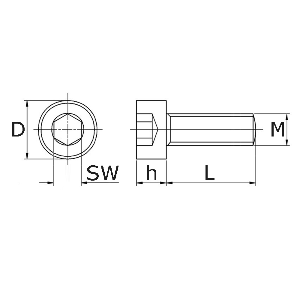 D=Ø-Kopf, h=Kopfhöhe, l=Gewindelänge, M=Gewinde, SW=Schlüsselweite