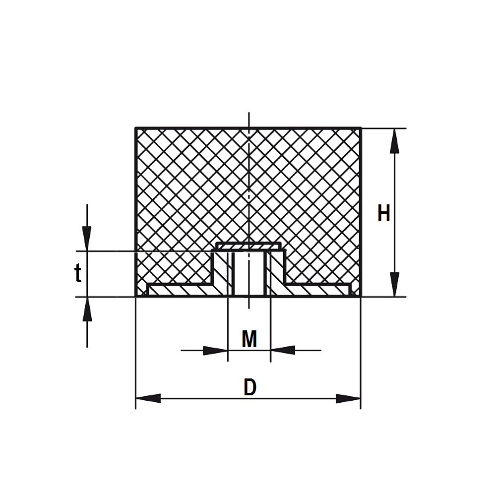 D=Durchmesser, H=Höhe, M=Gewindemaß, Mat. A=Gummisorte, Mat. B=Material Metallteile, N=Maximale statische Belastung in Newton, Shore A °=Shore-A Härte des Gummi, t=Gewindetiefe