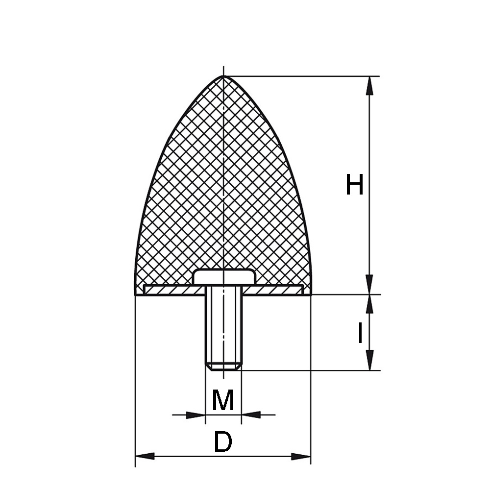 D=Ø-Größe, H=Höhe, l=Gewindelänge, M=Gewinde, Mat. A=Gummisorte, Mat. B=Material Metallteile, N=Maximale statische Belastung in Newton, Shore A °=Shore-A Härte des Gummi
