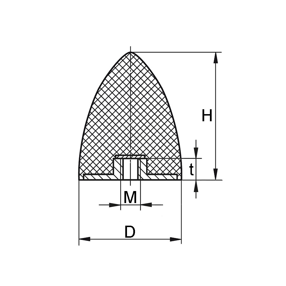 D=Ø-Größe, H=Höhe, M=Gewinde, Mat. A=Gummisorte, Mat. B=Material Metallteile, N=Maximale statische Belastung in Newton, Shore A °=Shore-A Härte des Gummi, t=Gewindetiefe