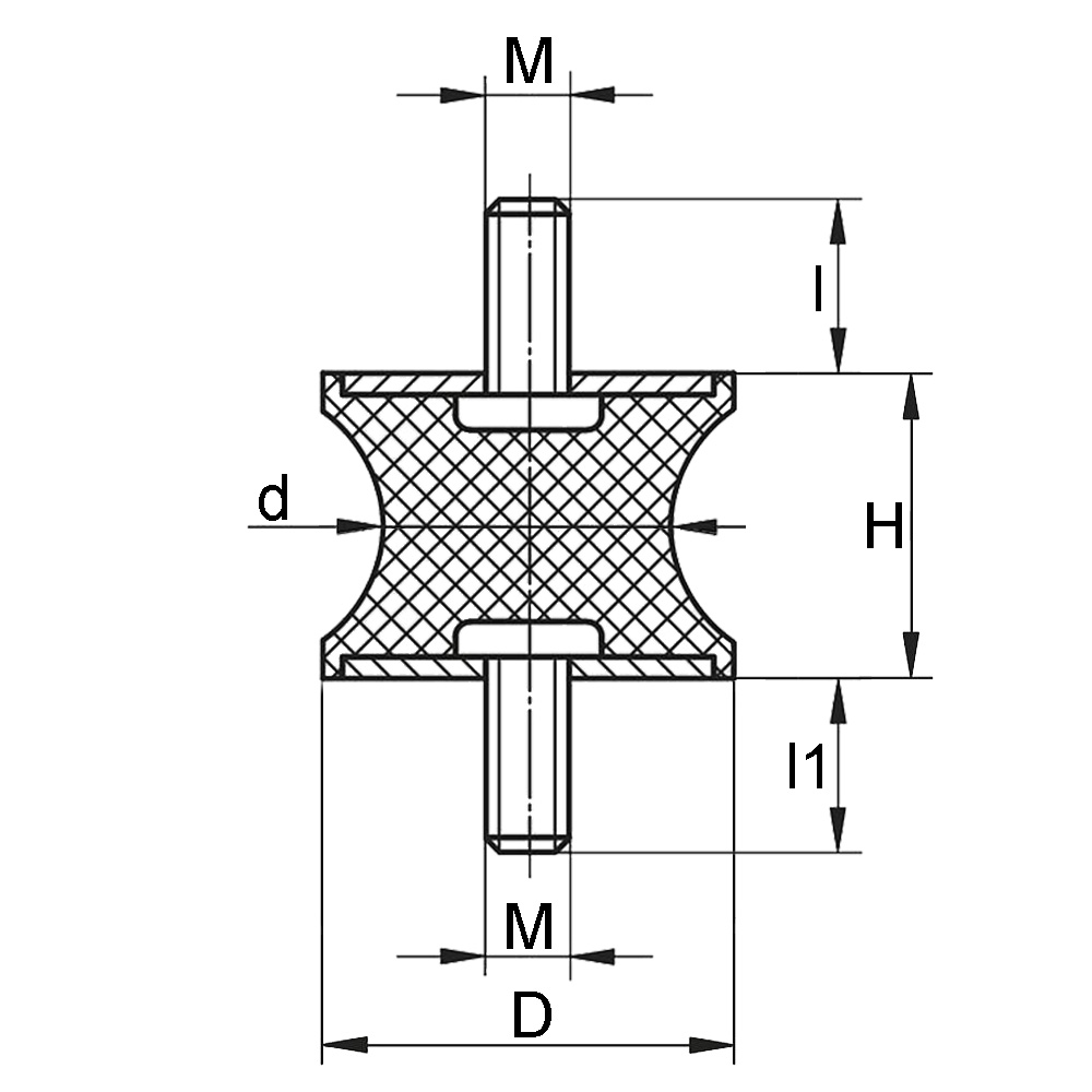 D=Ø-Größe, d=Taille-Ø, H=Höhe, l=Gewindelänge, l1=Gewindelänge, M=Gewinde, Mat. A=Gummisorte, Mat. B=Material Metallteile, N=Maximale statische Belastung in Newton, Shore A °=Shore-A Härte des Gummi