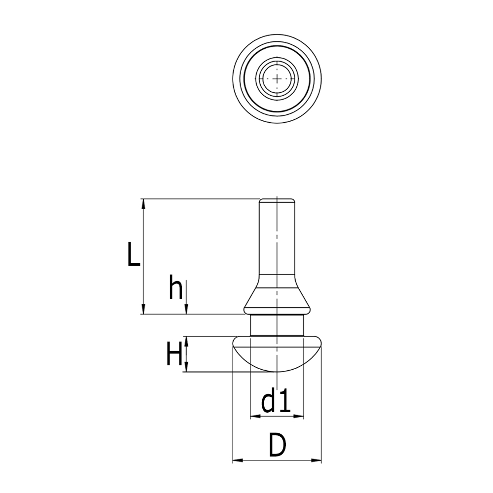 D=Kopfdurchmesser, d1=Zapfen-Ø, H=Kopfhöhe, h=Aussparungsmaß und max. Blechstärke, L=Zapfenlänge, Mat.=Material