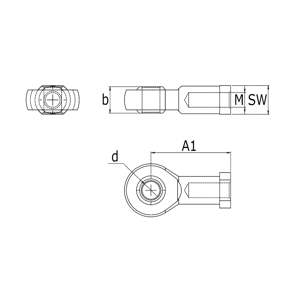 LegendeA1=Einbaulänge, b=Breite, d=Bohrung-Ø, M=Innengewindegröße, N=Max. statische Tragfähigkeit in Newton, SW=Schlüsselweite, Type=Standardisierte Typenbezeichnung