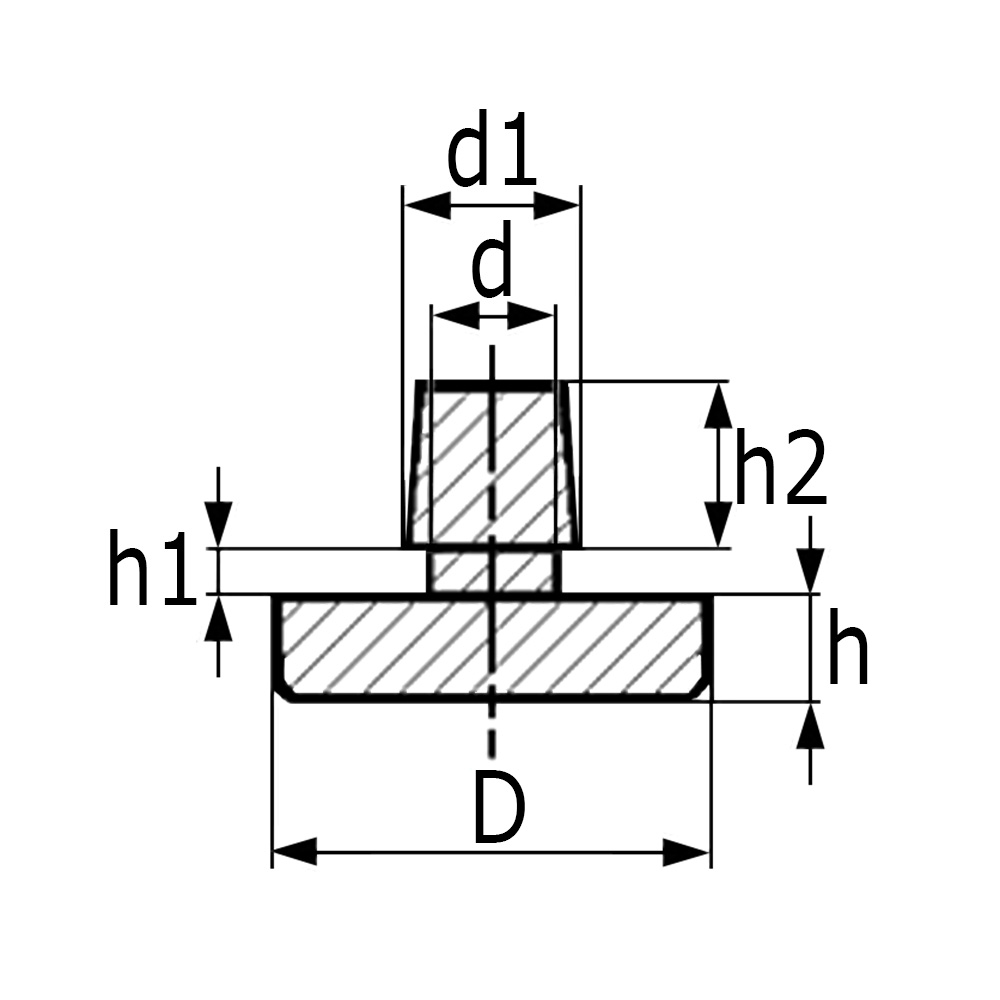 Bohrung=Montage Loch-Ø, D=Fuß-Ø, d=Zapfen-Ø klein, d1=Zapfen-Ø groß, h=Fußhöhe, h1=Blechstärke, h2=Höhe konischer Zapfen, Stärke=max. Plattenstärke