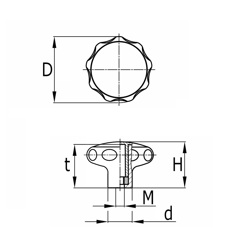 D=Knopf-Ø, d=Nabe-Ø, H=Totalhöhe, M=Gewinde