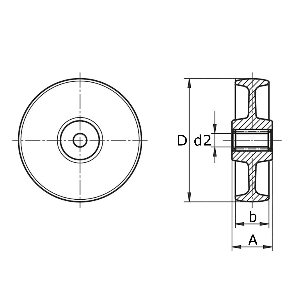 A=Nabenbreite, b=Breite Lauffläche, D=Ø-Bohrung, d2=Ø-Achsloch, K= Maximale zulässige statische Tragfähigkeit in kg bei 4km/h, Typ=Lagertyp