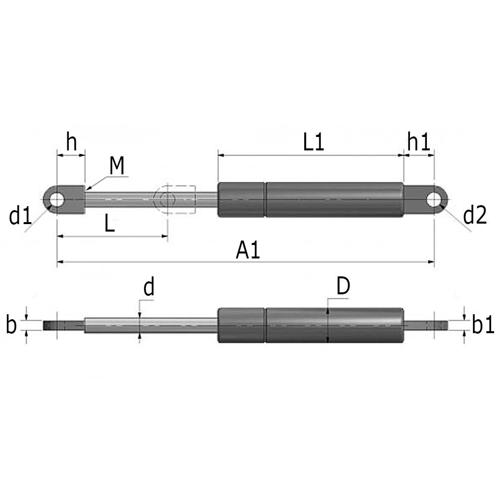 Gasdruckfeder Ø14/28, Stangenhub 300mm, Totallänge 750mm - 2500 Newton