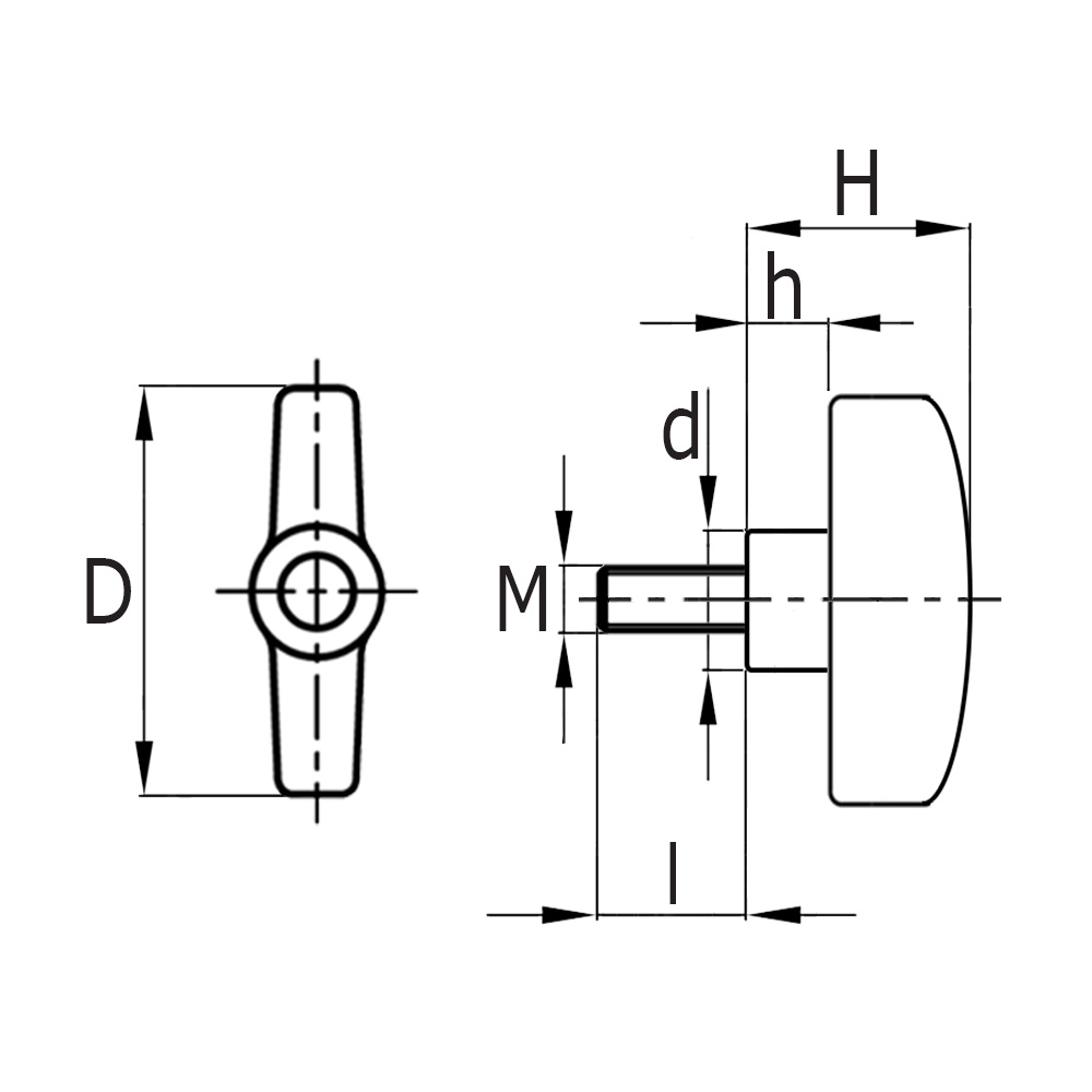 D=Knopflänge, d=Bund-Ø, H=Höhe, h=Bundhöhe, l=Gewindelänge, M=Gewindemaß