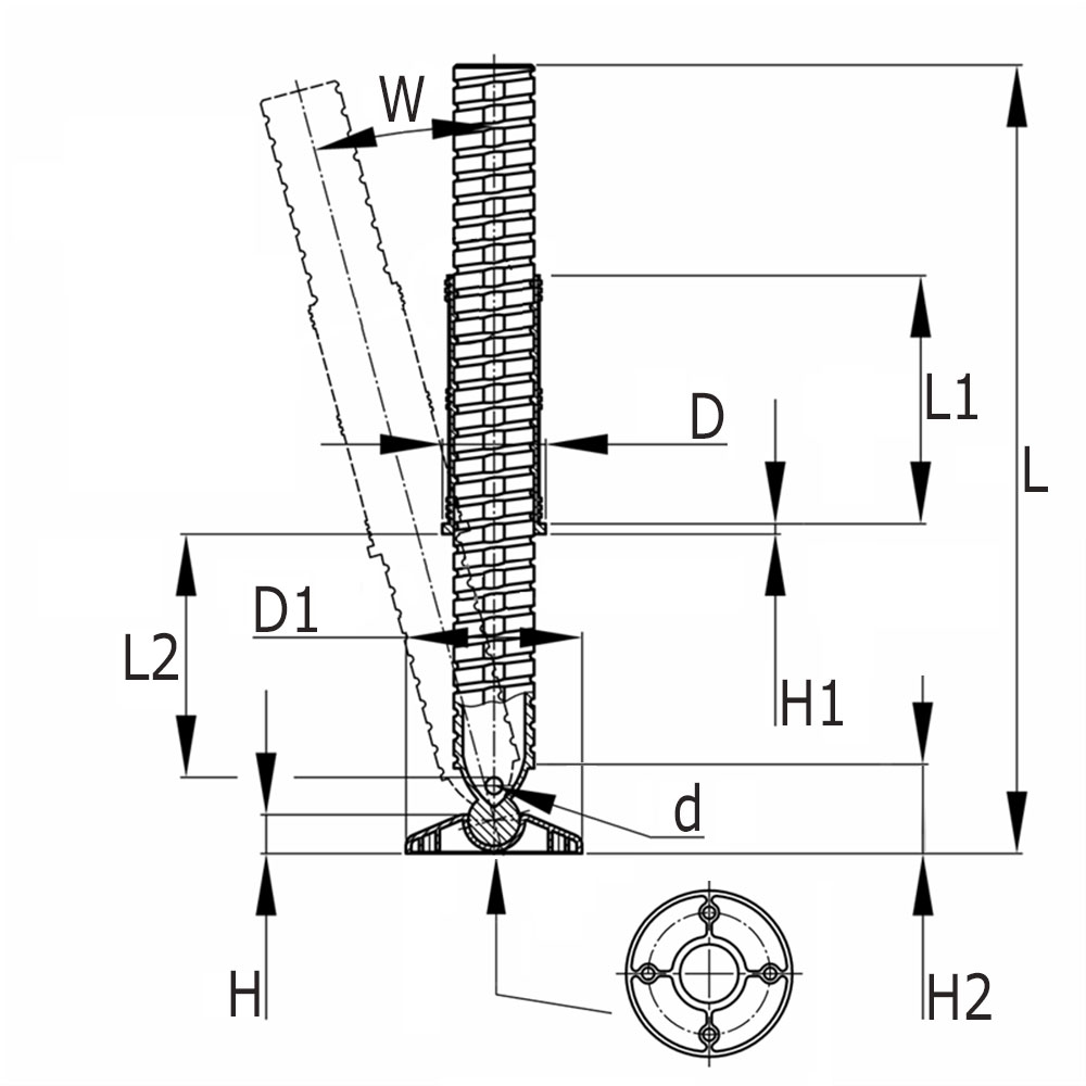 Ausf.=Wandstärke, D=Bund-Ø, D1=Fuß-Ø, H=Fußhöhe, H1=Bundstärke, K=Maximale statische Belastung in Kg, L=Totallänge, L1=Schaftlänge, L2=Verstellbereich, Rohrmaße=Rohraußenmaße, SW=Schlüsselweite in mm, W=Aufstellwinkel in °