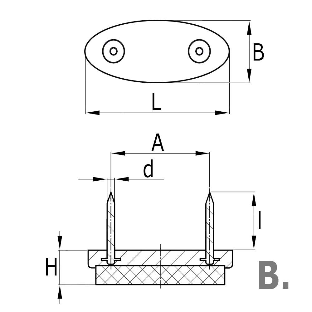 A=Abstand Nagelmitten, B=Breite, d=Nagel-Ø, H=Stärke, L=Länge, l=Nagellänge