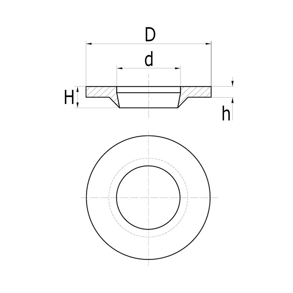 D=Außen-Ø, d=Loch-Ø, H=Gesammthöhe, h=Scheibenhöhe, M=Passend für Gewinde