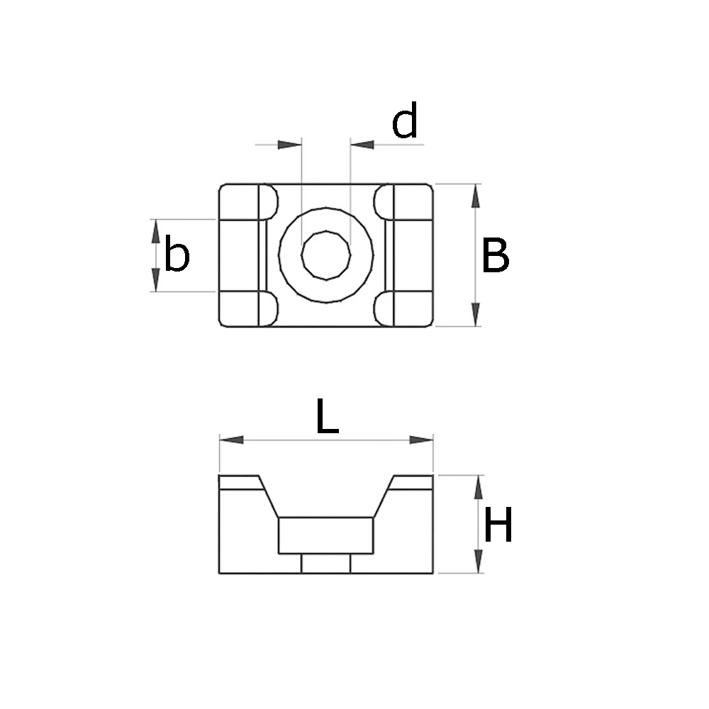 B=Breite, b=Breite Kabelbinder-Durchführloch, d=Bohrung für Schraube, H=Höhe, L=Länge