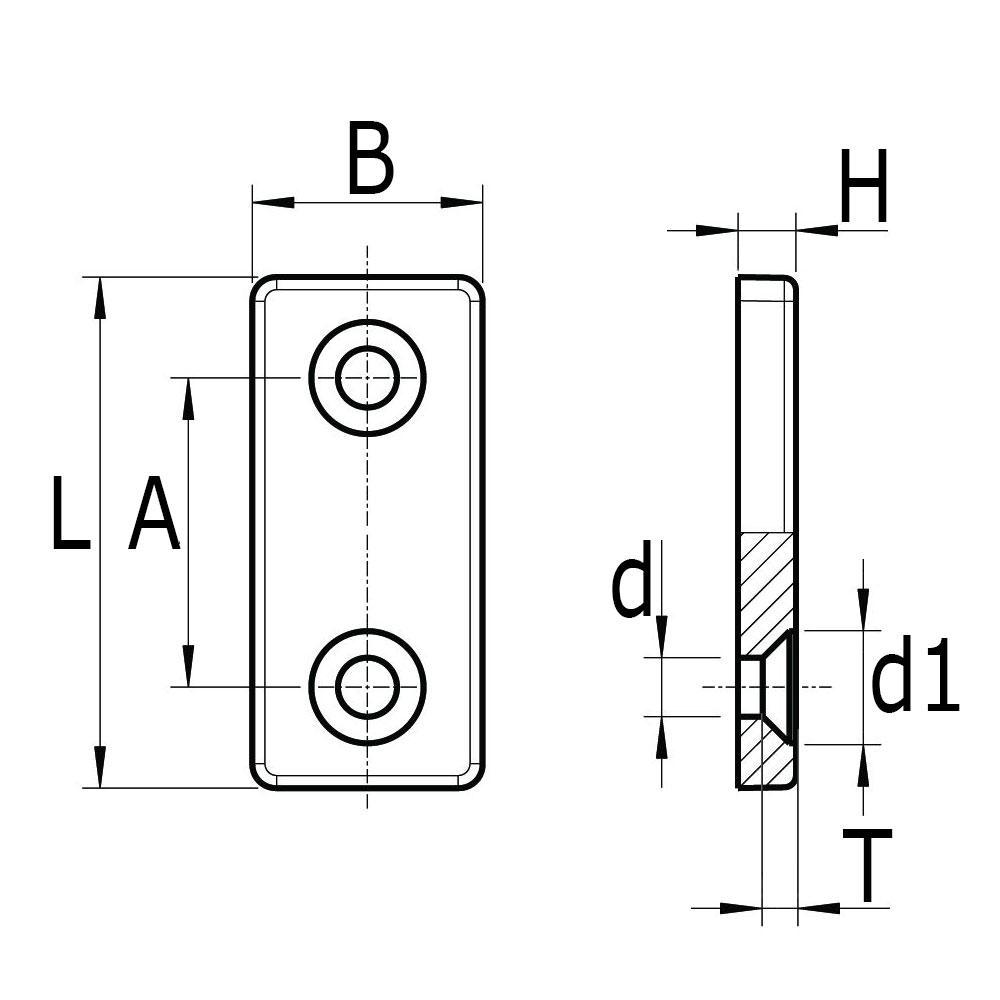 A=Abstand Bohrungsmitten, B=Plattenbreite, d=Bohrung-Ø, d1=Senkbohrung-Ø, H=Plattenstärke, L=Plattenlänge, Rohrmaß=Plattenmaß, T=Tiefe Senkbohrung