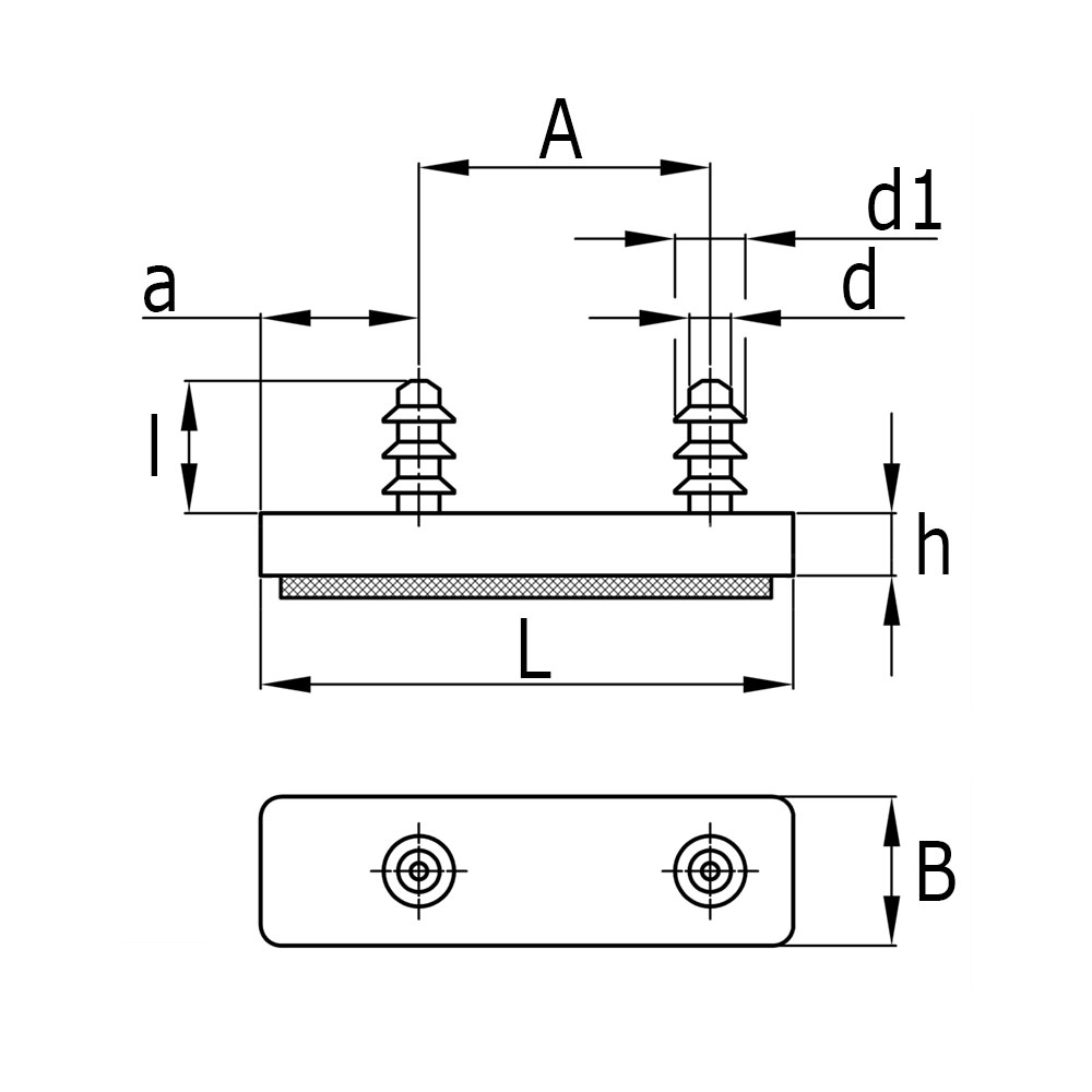 A=Zapfenabstand, a=Abstand zum Zapfenmitten B=Plattenbreite, d=Kern-Ø des Zapfens, d1=Lamellen-Ø des Zapfens, h=Plattenstärke, L=Plattenlänge, l=Zapfenlänge, Rohrmaß=Plattenmaß