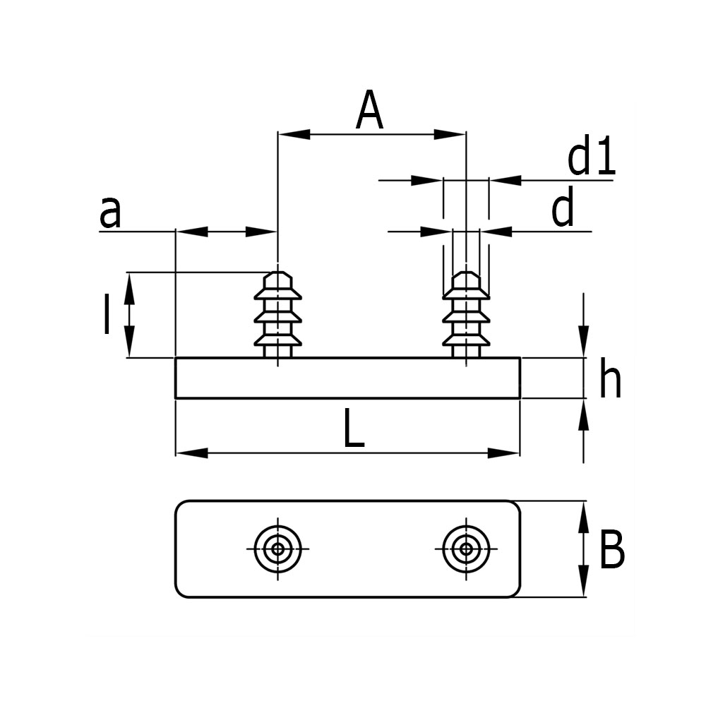 A=Zapfenabstand, a=Abstand zum Zapfenmitten B=Plattenbreite, d=Kern-Ø des Zapfens, d1=Lamellen-Ø des Zapfens, h=Plattenstärke, L=Plattenlänge, l=Zapfenlänge, Rohrmaß=Plattenmaß