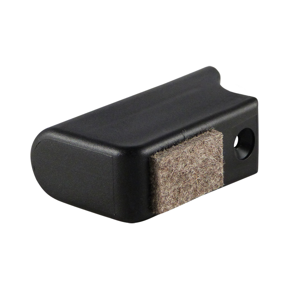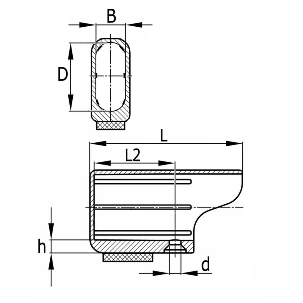 LegendeB=Innenbreite, D=Innenhöhe, d=Bohrung-Ø, h=Stärke Boden inkl. Filz, h1=Filzstärke, L=Länge, L2=Abstand zur Bohrungsmitte, Rohrmaß=Rohraußenmaß