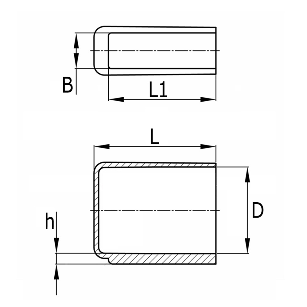 D=Innenhöhe, B=Innenbreite, h=Stärke Fuß, L=Länge, L1=Innenlänge, Rohrmaß=Rohraußenmaß