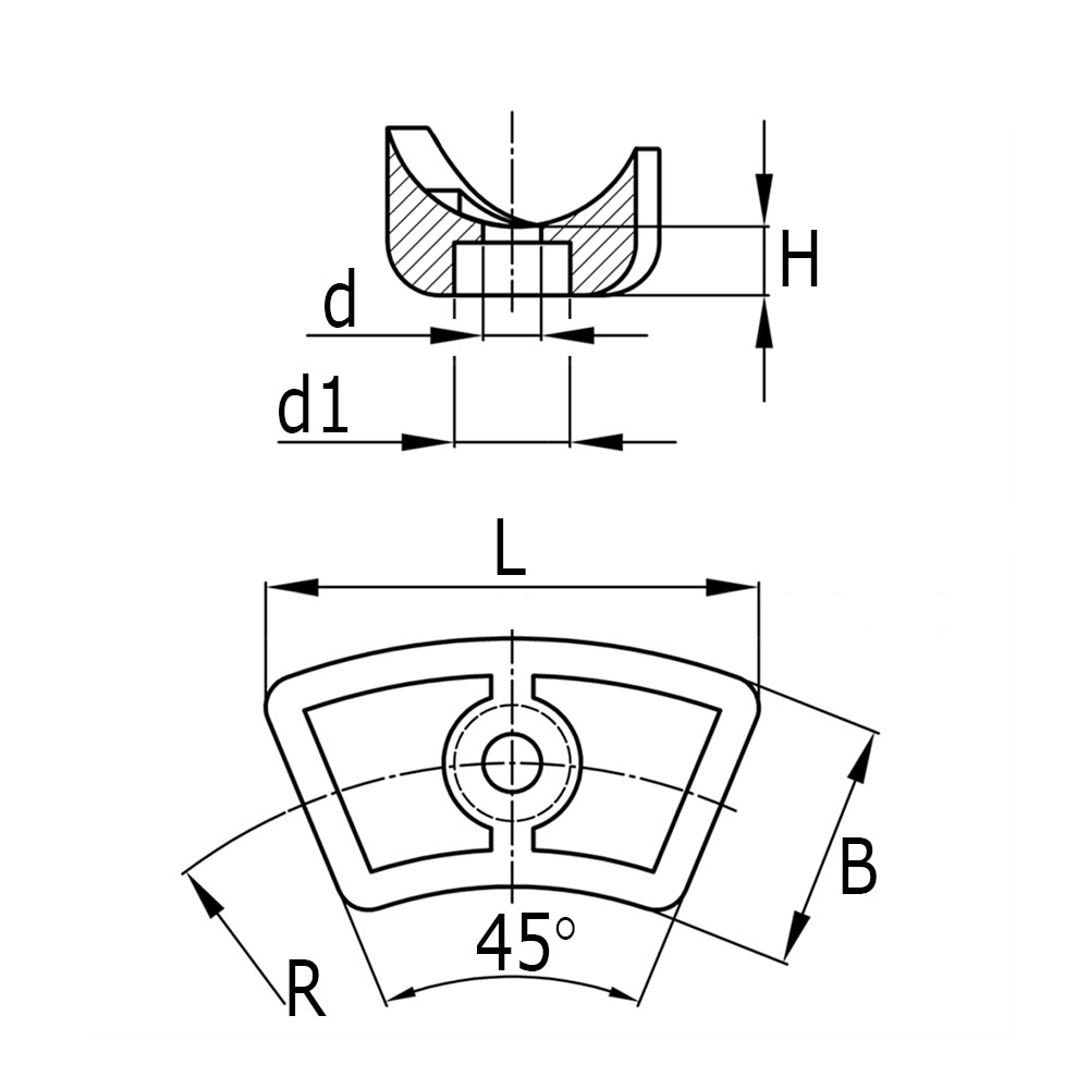 B=Breite Fuß, d=Bohrung-Ø, d1=Zapfenbohrung-Ø, h=Stärke Fuß, R=Radius, Rohrmaß=Rohraußen-Ø