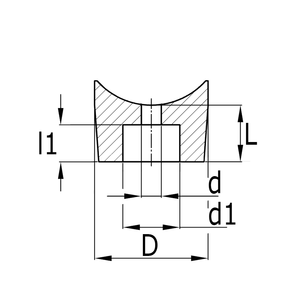 D=Fuß-Ø, d=Bohrung-Ø, d1=Senkloch-Ø, L=Höhe, l1=Höhe Senkloch, Rohrmaß=Rohraußenmaß
