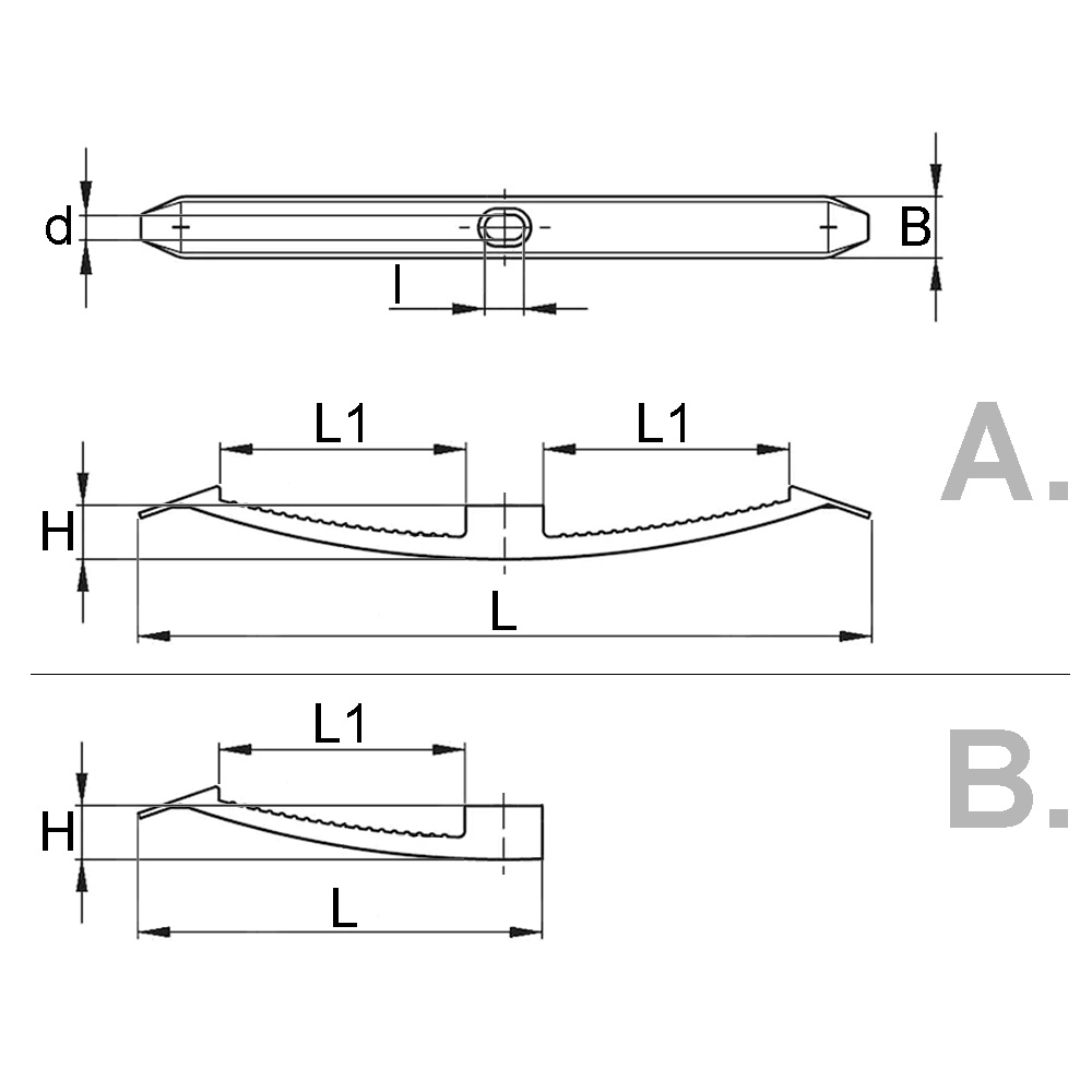 B=Breite, d=Ø-Bohrung, L=Totallänge (nicht montiert), l=Länge Bohrung, L1=Länge, Typ=Ein- oder doppelseitige Ausführung