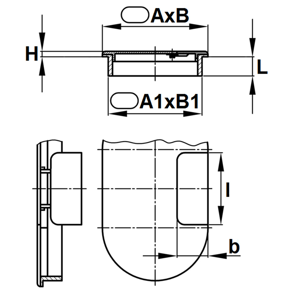 A=Länge Kopf, A1=Länge Schaft, a=Länge Kabelloch, Bohrung=LxB Montageloch, B=Breite Kopf, B1=Breite Schaft, b=Breite Kabelloch, H=Kopfhöhe, L=Schaftlänge