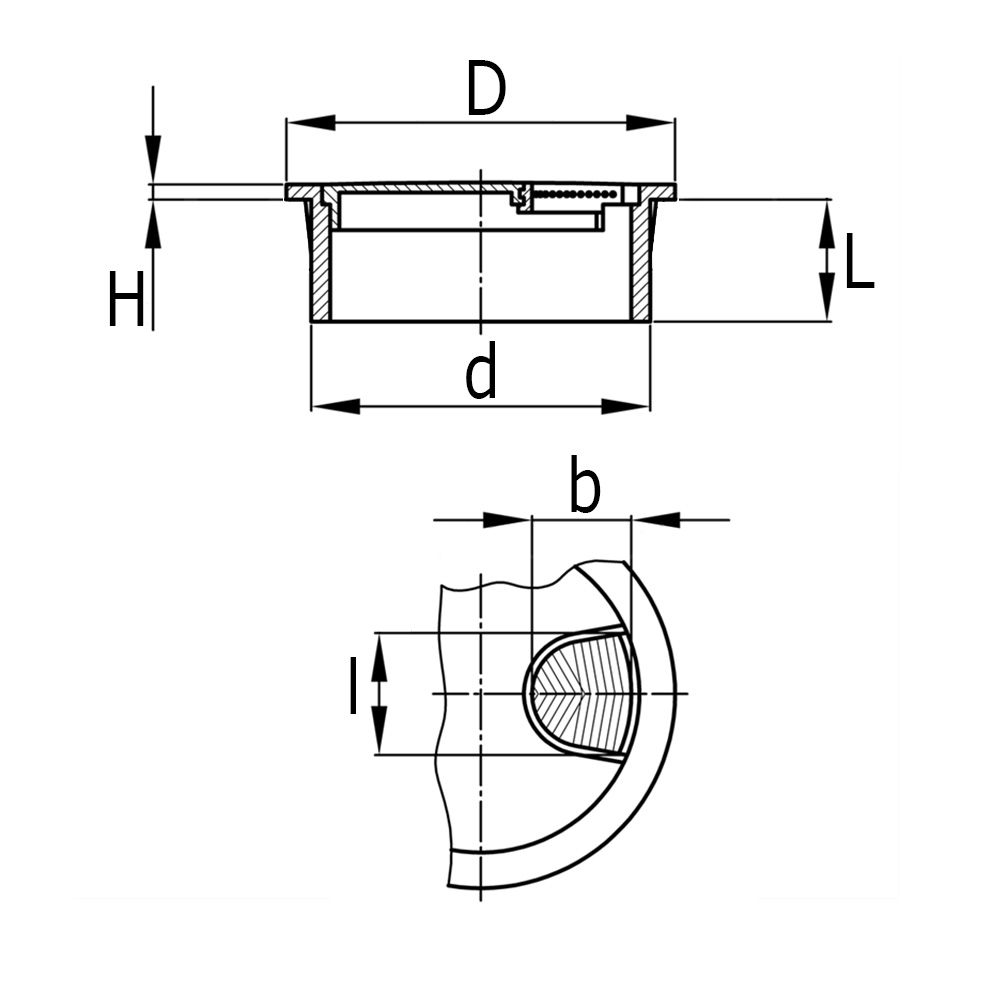 a=Breite Kabelloch, Bohrung=Ø-Montageloch, b=Breite Kabelloch, D=Ø-Kopf, d=Ø-Schaft, H=Kopfhöhe, L=Schaftlänge