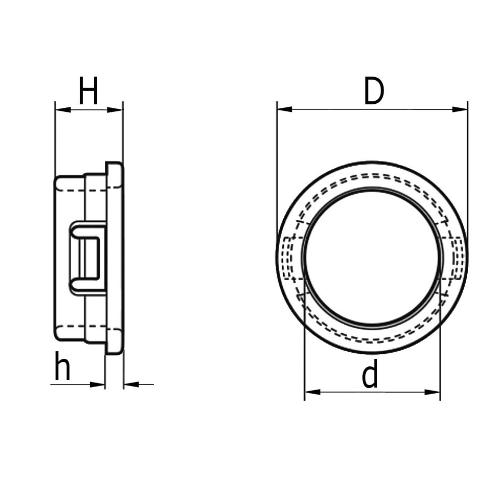 Bohrung=Ø-Montageloch in mm, D=Ø-Außen Rand, d=Ø-Durchführung, H=Totalhöhe, h=Randstärke, Stärke=Maximale Blechstärke in mm