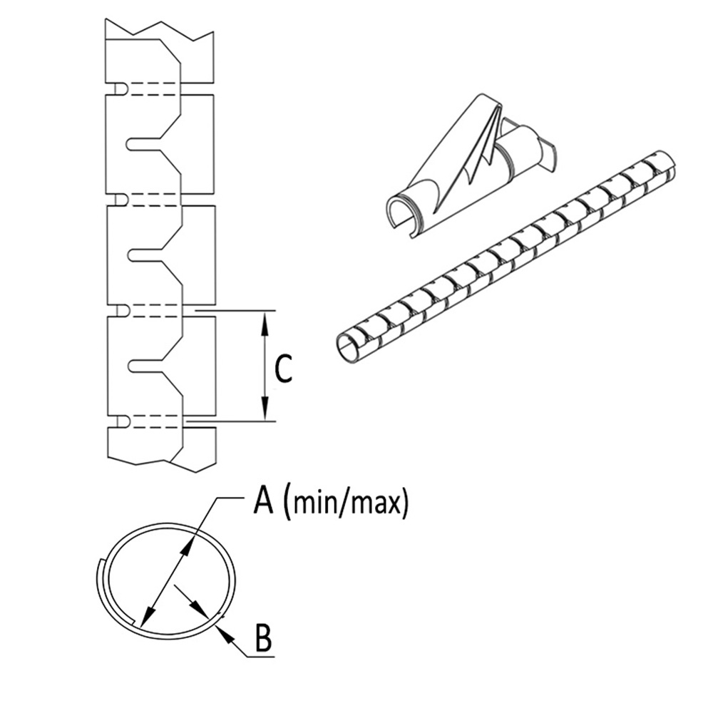 A=Dürchmesser, B=Materialstärke, C=Sektionslänge, L=Rollenlänge (meter), Typ=Ø-Bündelmaß Bereich