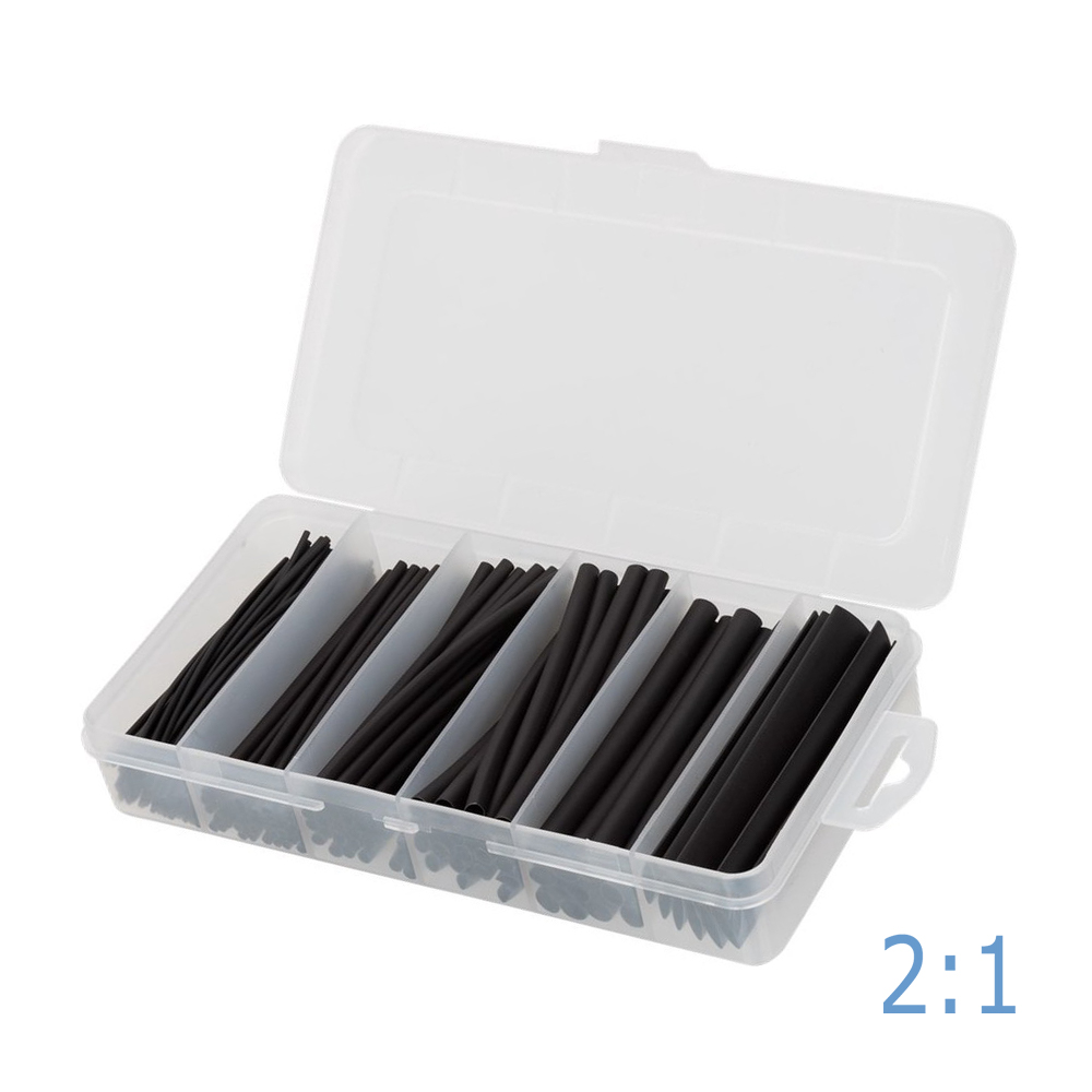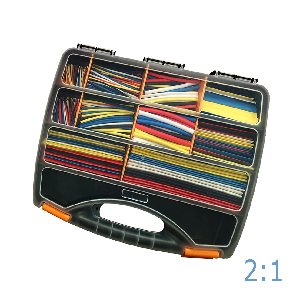 - Dünnwandige Schrumpfschlauch 2:1-Set ist in verschiedenen Sortimentskästen erhältlich, sowohl in Standard-Schwarz als auch in einem Farbiger Set und in Durchmessern von Ø 1,2 mm bis Ø 25,4 mm (ungeschrumpft)
