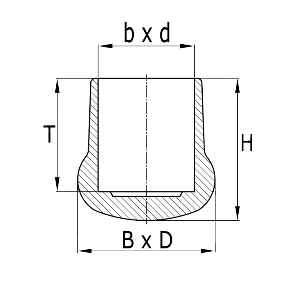 B x D=Außenmaße der Kappe, b x d=Innenmaße der Kappe, H=Höhe, Rohrmaße=Rohr Außenmaß, t=Tiefe