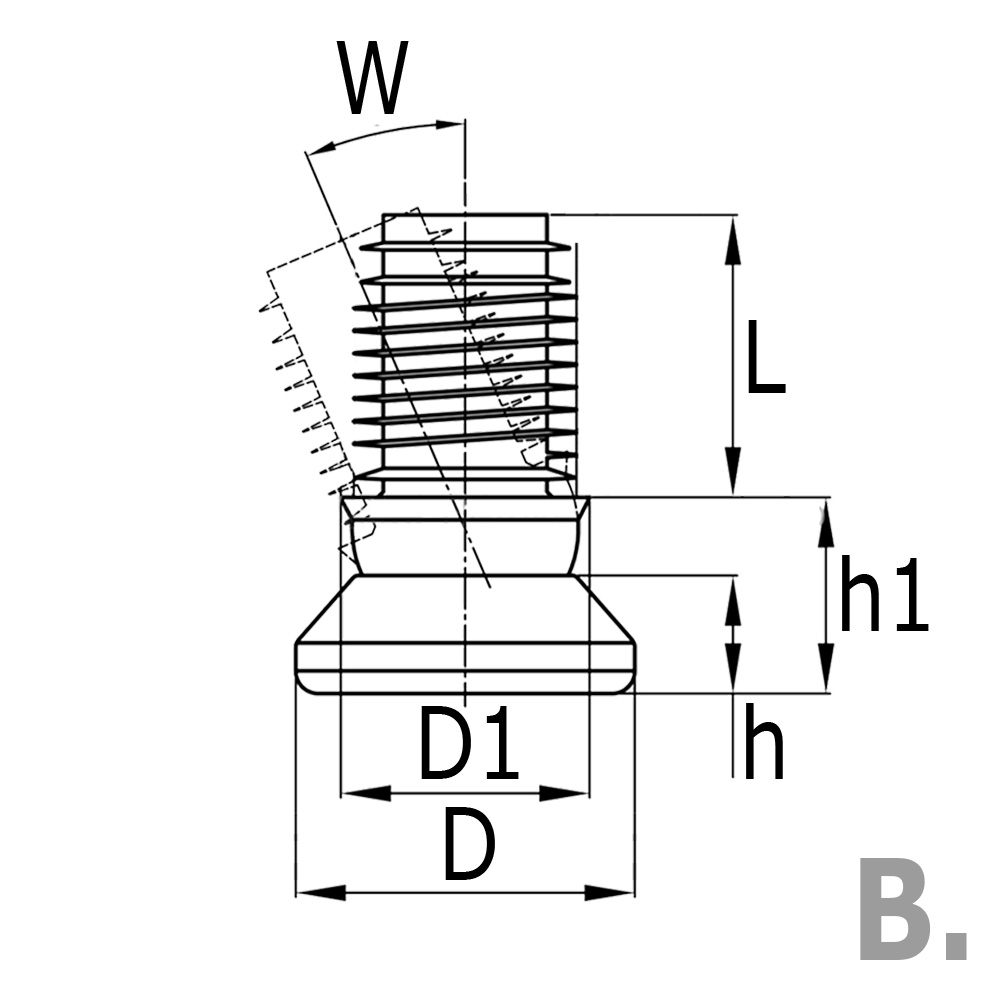 Ausf=Wandstärke des Rohrs, D=Fuß-Ø, D1=Bund-Ø, h=Höhe, h1=Hohe Gelenk + Fuß, L=Schaftlänge, Rohrmaße=Rohr Außenmaß, W=Maximale Aufstellwinkel in °