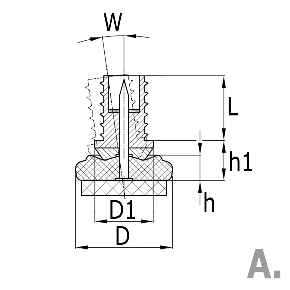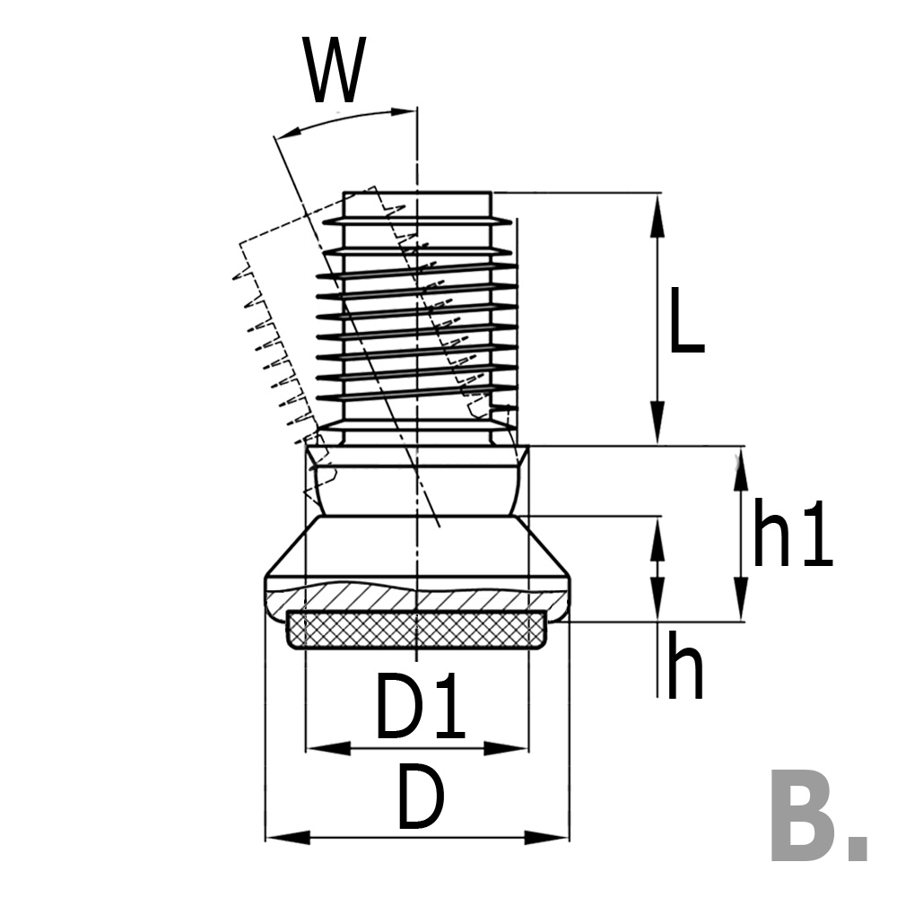 Ausf=Wandstärke des Rohrs, D=Fuß-Ø, D1=Bund-Ø, h=Höhe, h1=Hohe Gelenk + Fuß, L=Schaftlänge, Rohrmaße=Rohr Außenmaß, Typ=Gelenk Typ, W=Maximale Aufstellwinkel in °