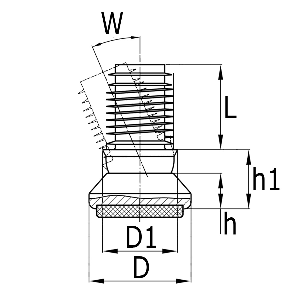 Ausf=Wandstärke des Rohrs, D=Fuß-Ø, D1=Bund-Ø, h=Höhe, h1=Hohe Gelenk + Fuß, L=Schaftlänge, Rohrmaße=Rohr Außenmaß, Typ=Gelenk Typ, W=Maximale Aufstellwinkel in °