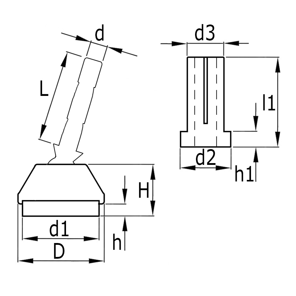 D=Ø-Fuß, d=Ø-Klemmstift, d1=Ø-Filz, d2=Ø-Bund, d3=Ø-Schaft, H=Totalhöhe Fuß, h=Filzstärke, h1=Bundhöhe, L=Stiftlänge, l1=Schaftlänge