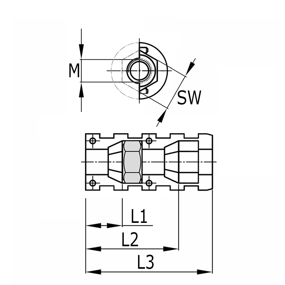 Ausf.=Wandstärke, L1=Länge bis zur Mutter-1, L2=Länge bis zur Mutter-2, L3=Totallänge, M=Gewindemaß, Rohrmaße=Rohraußen-Ø, SW=Schlüsselweite, Typ=Anzahl Sechskantmuttern