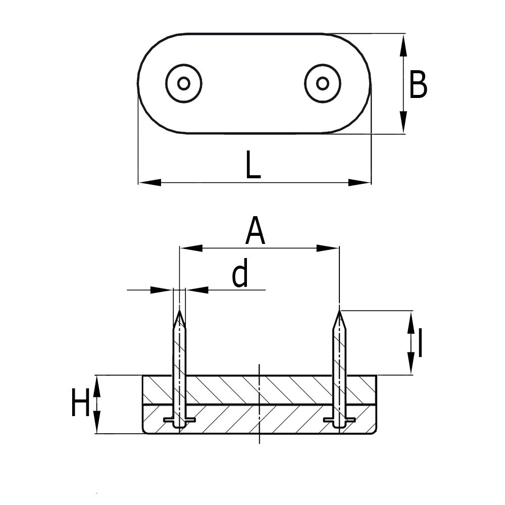 A=Abstand Nagelmitten, B=Breite, d=Nagel-Ø, H=Stärke, L=Länge, l=Nagellänge