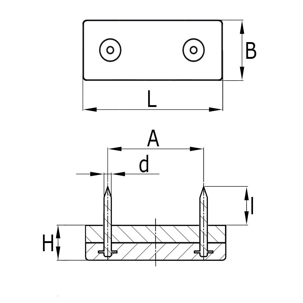 A=Abstand Nagelmitten, B=Breite, d=Nagel-Ø, H=Stärke, L=Länge, l=Nagellänge