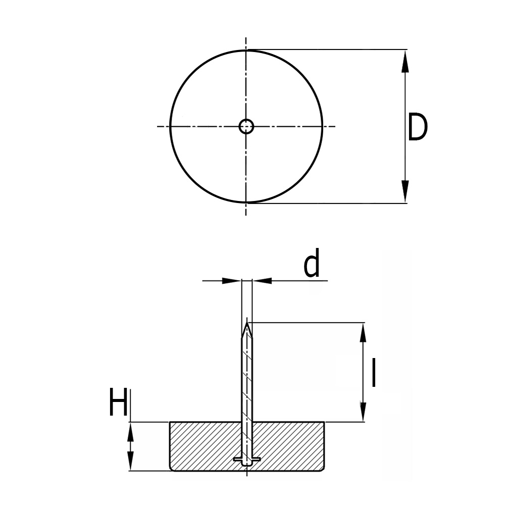 D=Gleitfläche-Ø, d=Nagel-Ø, H=Stärke, l=Nagel Länge, Mat.=Kunststoffart