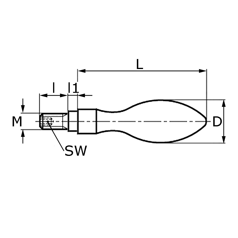 D=Griff-Ø-groß, d=Griff-Ø-klein, L=Grifflänge, l=Gewindelänge, l1=Länge, M=Gewindemaß, SW=Schlüsselweite